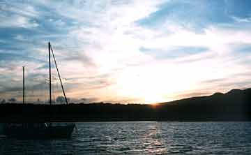 ランチの入り江は、風をあまり遮らないので、今晩のアンカリングスポットには適さないということで、同じ島の別な入り江に行ってみる。しかしここもこの風ではあまりいいポイントとはいえない。 ちょっと遠いが、ランギトト島とその隣の島の間の入り江まで行くことにする。ここまで行くと、明日ハーバーに帰るのが遠くなるので、早起きしなきゃいけない。でも、まあ仕方がない。チャートを見ても、この入り江よりは、ランギトト島の入り江のほうが快適そうだ。さあ、セールを上げて出発だ。 真風速で32.5ノットのランニングでかっとぶ。時にサーフィングする。サーフィングは気持ちいい。 ロイのナビゲーションで私が舵。 1時間くらいで到着。ここはいい。しっかり風が遮られている。風は相変わらず強いが波はない。